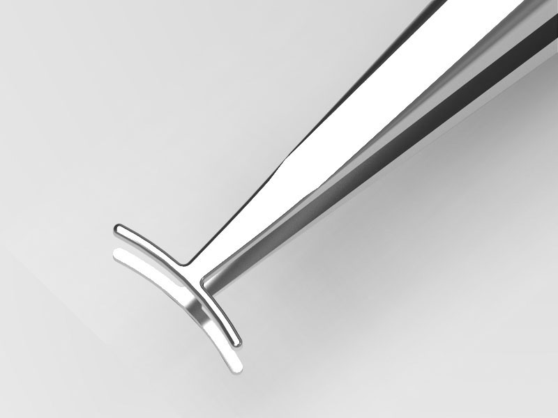 Forceps with tips anatomically designed for the stripping/peeling of the delicate Descemet membrane . The forceps grasp the membrane at the edge and perform the detachment of the Descemet lenticle by means of a peeling action. At this step the membrane is secured to its support by the suction system. Cleavage of the membrane is performed with the Fogla hook J2891A