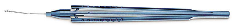 23G coaxial holder, slightly curved shaft, for scleral fixation lenses with T-shape/anchor loops. The design of the forceps allows you to gently embrace the loops of the lens (IOL) at the base, managing the insertion through the scleral incisions. The implantation of the IOL results in safety and ensures repeatability.