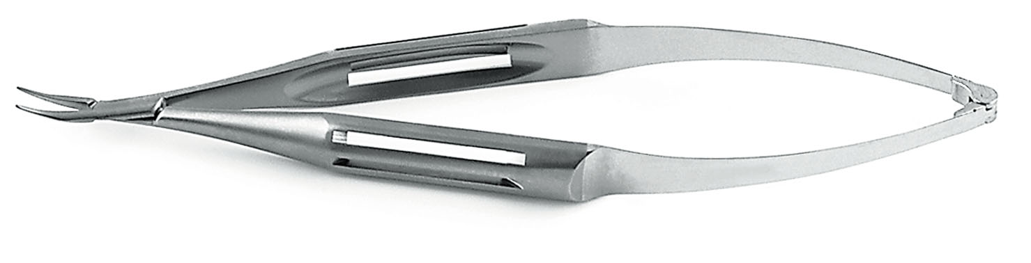 Stainless steel needle holder, curved, without lock, with delicate jaws, overall length: 120 mm. Recommended for 8-0 to 10-0 sutures